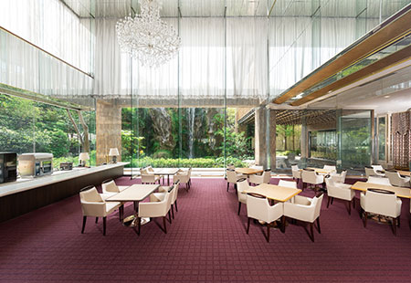 中庭に流れる滝を眺めながら、ゆったりとお寛ぎいただける奈良ロイヤルホテルならではのラウンジです。お待ち合わせやご歓談にぜひご利用ください。
